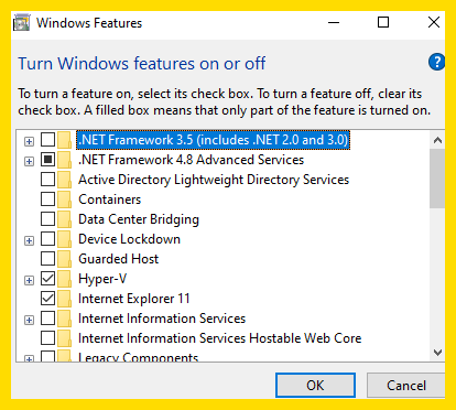 - In the bottom left (should say "Type here to search" bar and type in add features and there will be an option to "Turn Windows Features on or off". Open this and this should open up the menu below