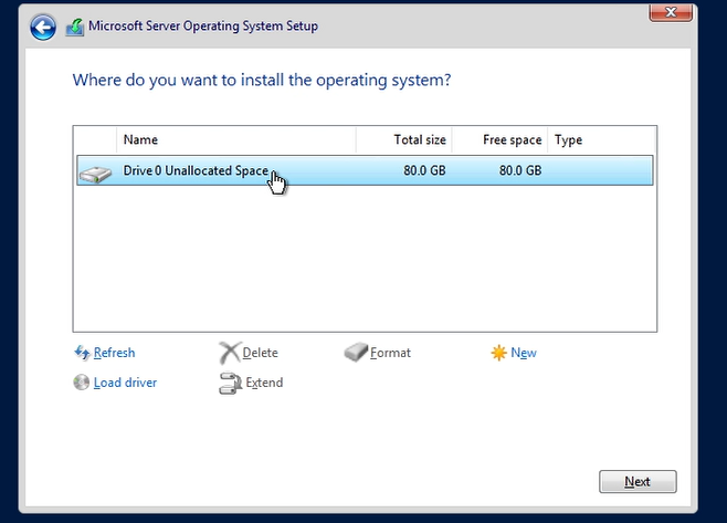 - Press next and there will be different options. Make sure to press the option to install Windows Server Standard Edition (Desktop Experience) and press next. Press Custom and press next. A drive should show up and if you have set it up properly, it should have around 60-120GB space (Mines is 80).