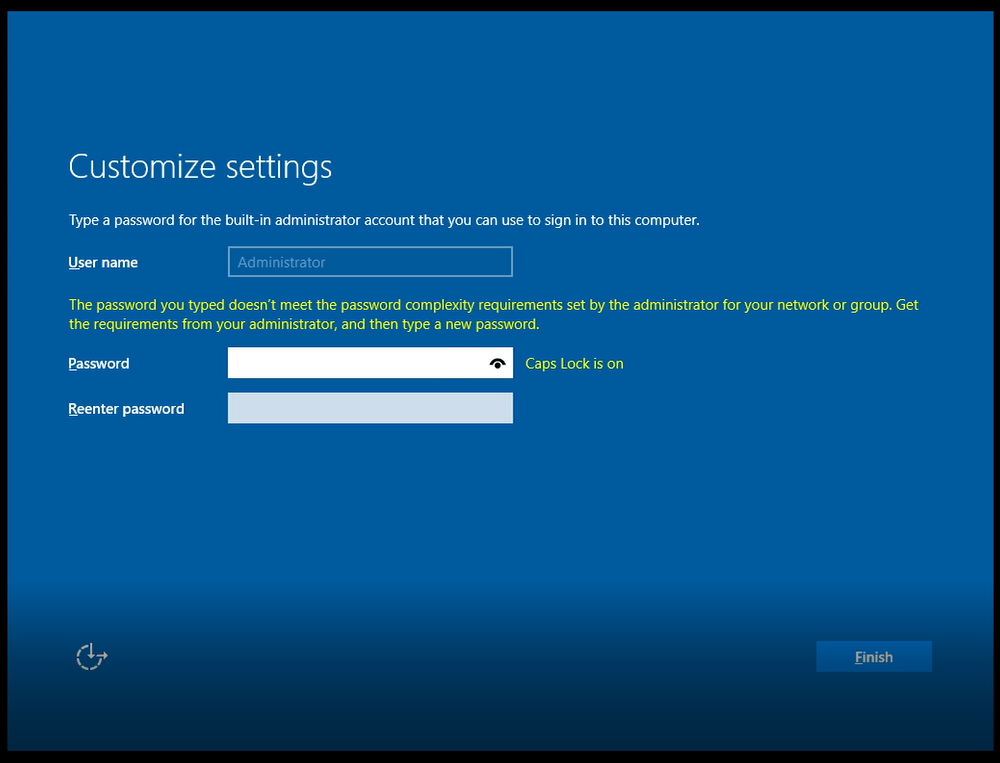 - When next is pressed, Windows should start installing the files which can take around 5-10 minutes (HDD would be slower). Once installed, it will ask you to enter a password (I would recommend one easier to remember) as shown below and then press next.
