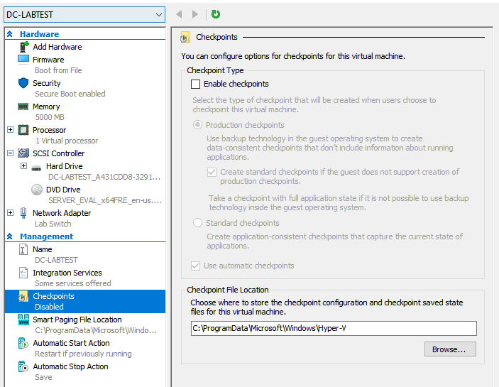 - Make sure to Disable Checkpoints as they can use up your space unnecessarily. Right click the VM and then press settings. Find the option called Checkpoints and uncheck the box. (If it says merge in progress on your VM, make sure to right click and press cancel merge)