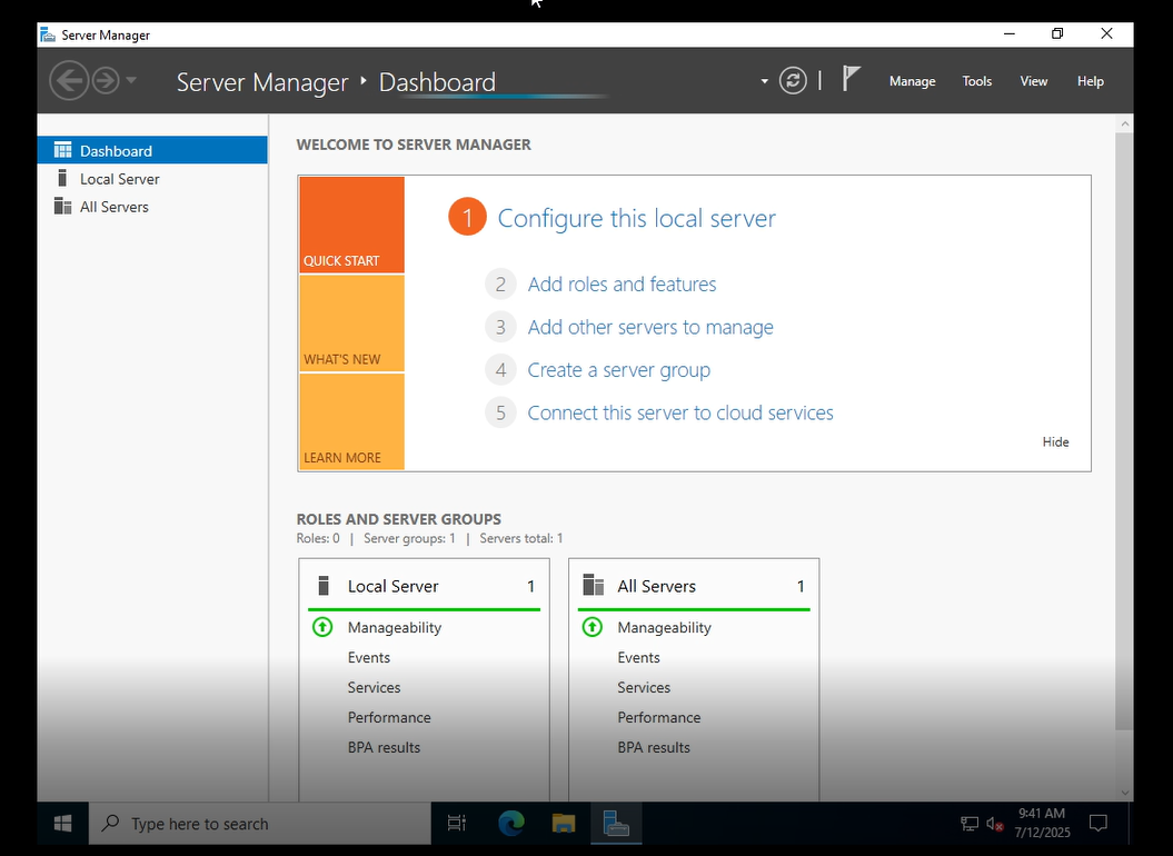 - Windows Server 2022 will complete the final configuration page and you should receive a Window like below which should confirm it is all ready to go. (Don't worry about any errors showing up, we will address those in the next day)