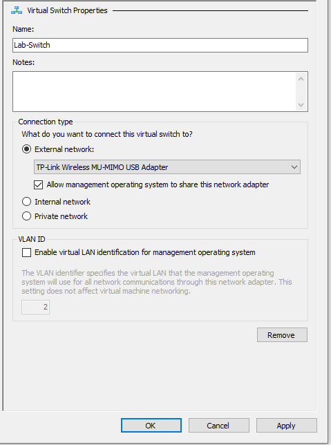- Press the external option and then press next and make sure to name your switch something generic like Lab switch or whatever you desire. Choose the right WIFI card (yours will be Intel Wi-Fi AX or if you are using ethernet it will be Intel Ethernet connection) and leave the checkbox ticked. Then press next which should create the switch for you and will let your VM connect to the machine.