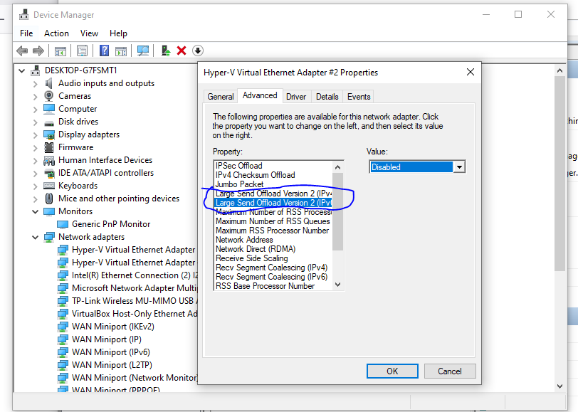 - Press Advanced and then there should be two options called "Large send Offload". Disable them both and press ok. This prevents performance issues when accessing the VM and having it enabled will cause more issues down the line. Congratulations, We are finally done. I know it was me rambling half the time but now lets go to section 3.3