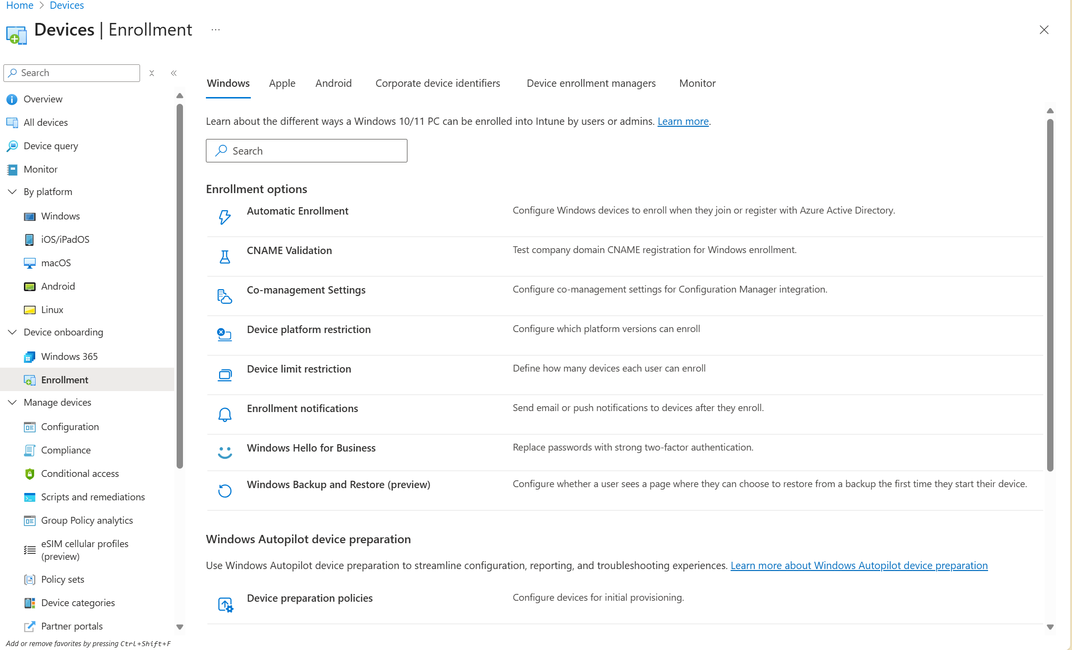 A well laid out page right? This is one of the easier pages to navigate and now we need to access the deployment profile page. To do this, press the devices tab -> enrollment (under device on boarding)
