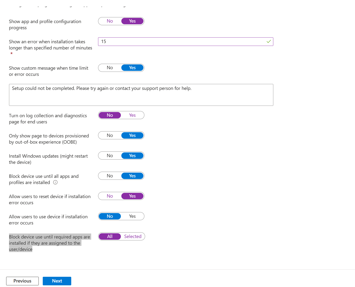 Only show page to devices provisioned by out-of-box experience (OOBE) - Another option to press yes as our profile is a OOBE deployment that is used which would apply in my situation