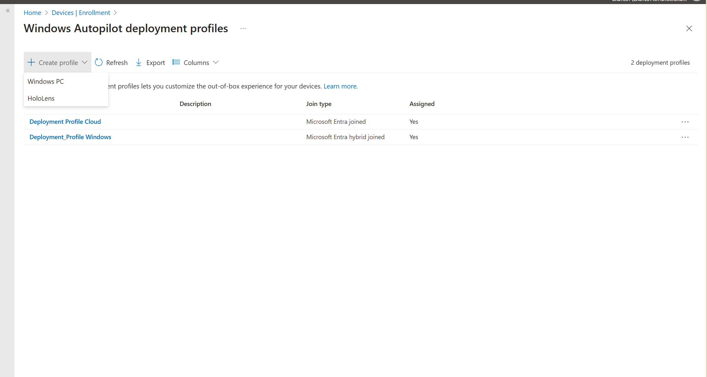 The above menu should show up. As you can I see I have created two different profiles, one is only Entra joined whereas the other is hybrid joined which you will see in different organisations.