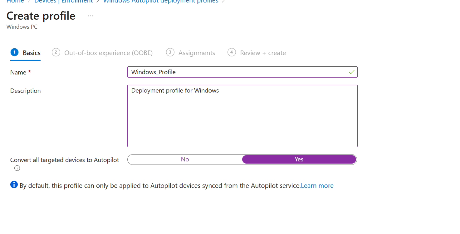 However, there is an option to convert all targeted devices to autopilot as that will transfer our device into autopilot. Make sure this is enabled as shown.