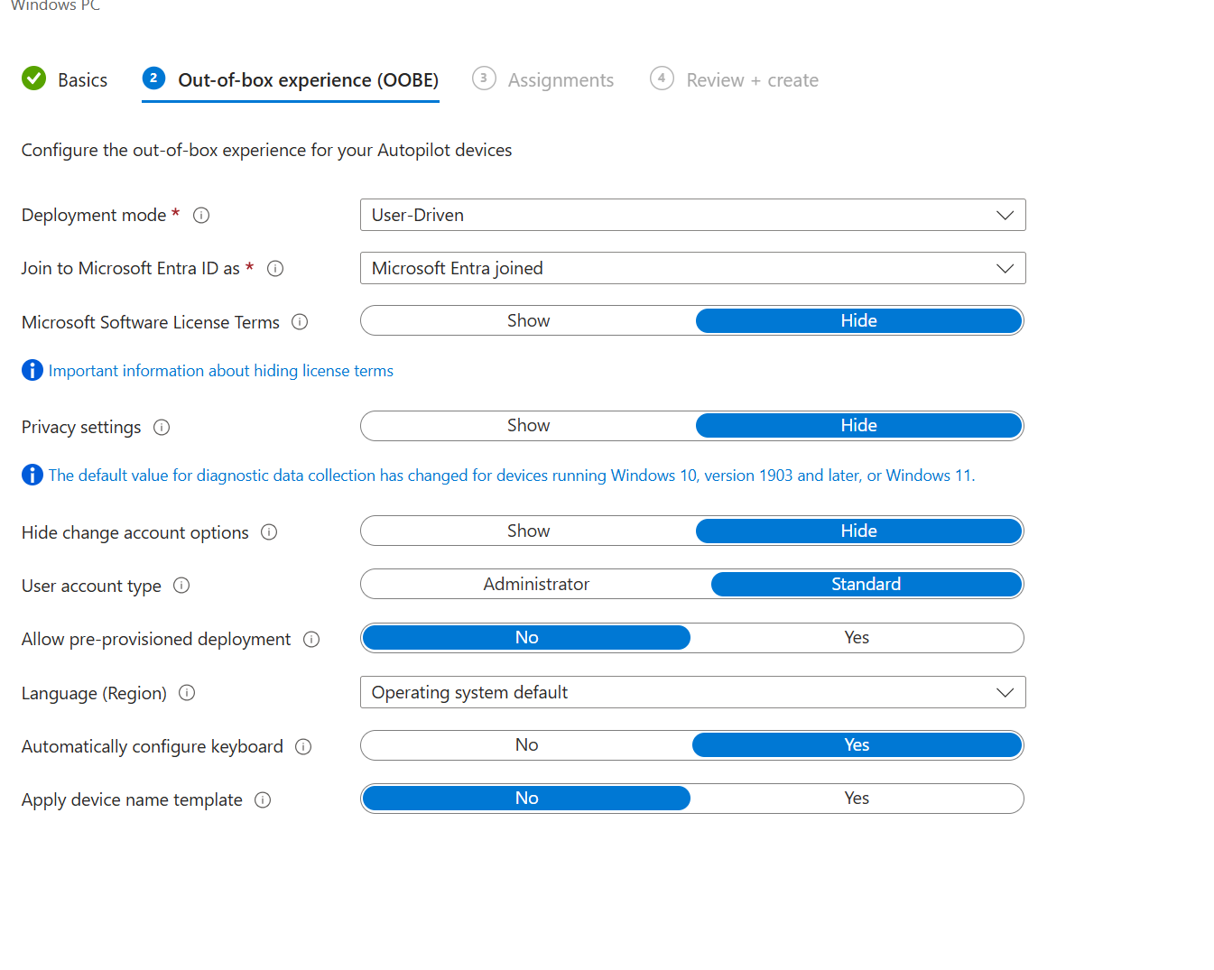 So what is a deployment profile. Well a deployment profile is kind of like a configuration file which determines how a device should be setup during autopilot deployment. Every autopilot device enrolled to Entra will have a deployment profile applied to it and there will never be a device which will not have one applied.