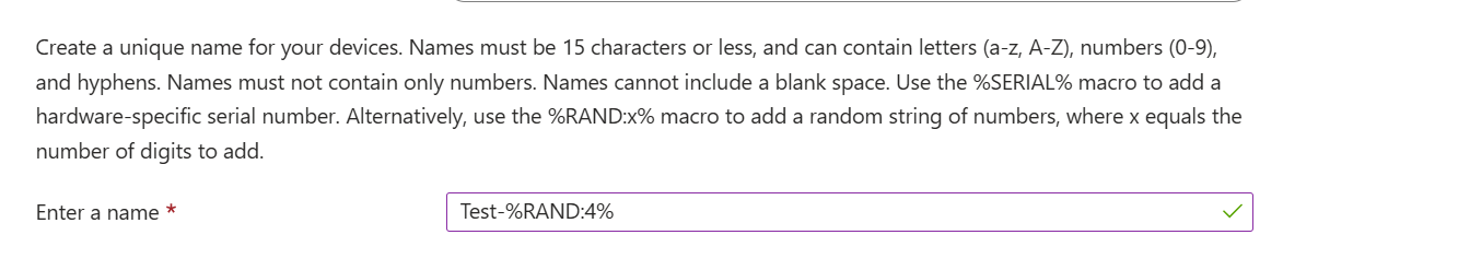 Apply device name template - Allows us to choose the name of the device. I will apply a device name template to show me that the device has enrolled successfully. I will use the below template