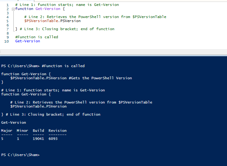 Get-Version This is an example of a function that has been created with a Line to Line breakdown what each line does. That is essentially what a function is, a block of code that does something.