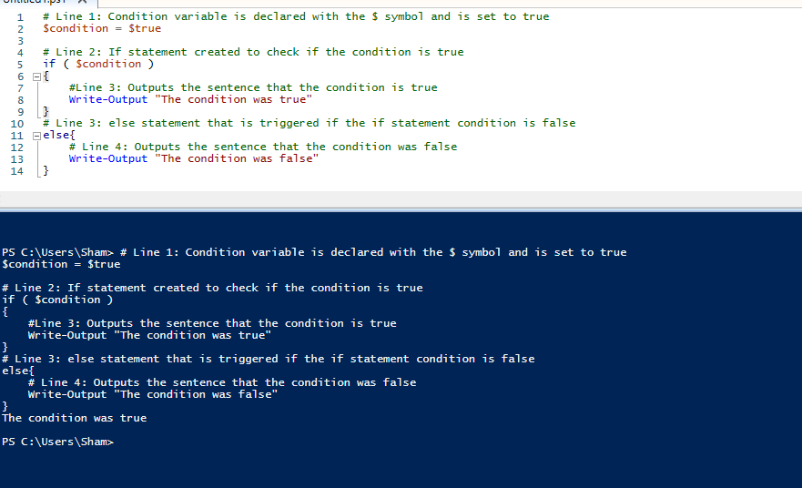 Another example of how conditions work in PowerShell ISE. The if condition is met which means that the output "the condition was true" is outputted.