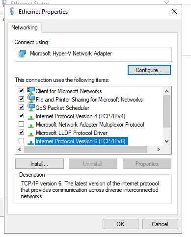 The box above will show up. Make sure to uncheck Internet Protocol Version 6 as there has been times when it has caused issues with Azure AD connect which we will use. Uncheck that box and go to Internet Protocol version 4.