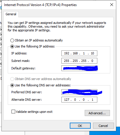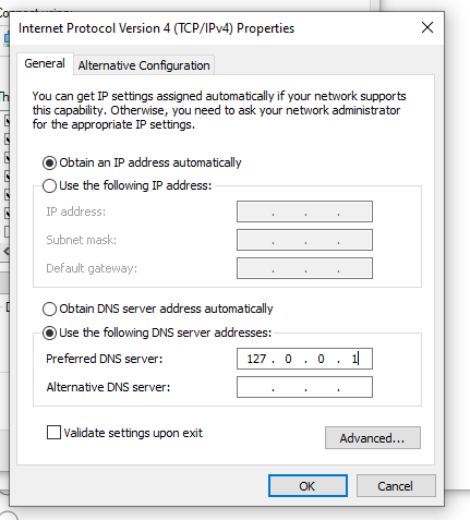 This is an example of how this would look with 127.0.0.1 as the preferred DNS server and the IP will be set to obtain automatically