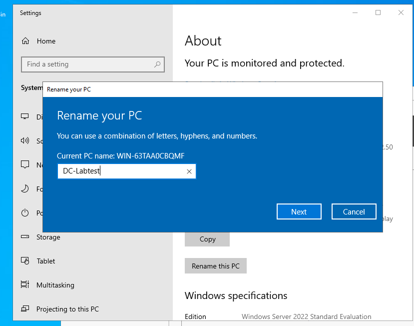 Final step, Rename your PC to a meaningful name to use. On your VM search for view your PC name in the bottom left search bar and the settings page should open. Press the Rename your PC button. Choose a name like DC-Lab or name it the same as your Host VM.
