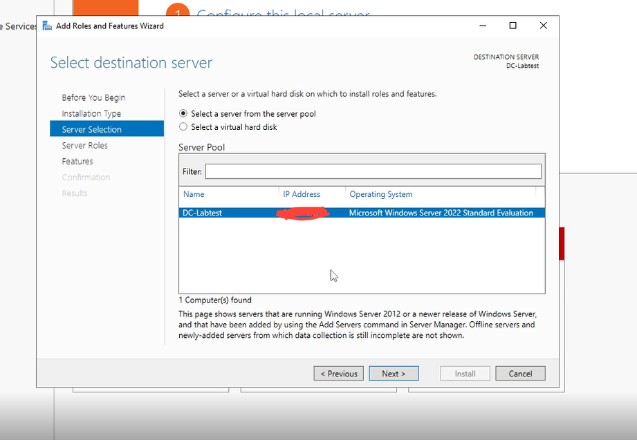 Press next and choose Role based or Feature Installation. Press next and you should see your server in the list. Press Next and make sure your server shows an IP address.