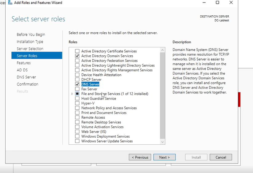 Press Next and you will be greeted with different checkboxes. But all you need to check is Active Directory Domain Services and DNS server. Then press next. (Small popups will show up to confirm your choice. Press Add Features)
