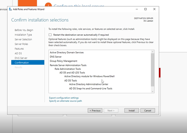 The confirm installation window will pop up and make sure the Restart the destination server automatically if required box is unchecked. Press install and this can take 2-4 minutes to install. Once done, restart your VM and proceed to the next stage.