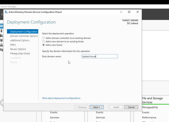 A Deployment configuration window should pop up and as you can see there are different options. Press add a new forest, then enter your root domain name which is what your domain will be called. You can use any name such Labtest or Techwithreps123 etc. I have used Labtest.Intune to make it easier to identify. Click next and the Domain controller option will show up