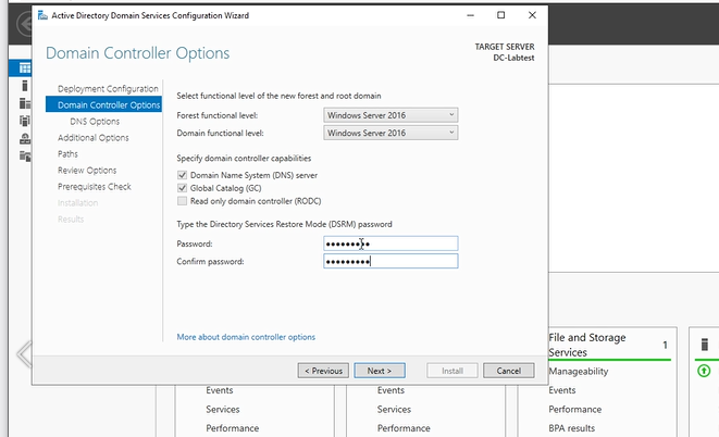 Now the domain controller options. This part is nothing to worry about, leave the forest functional and domain level functional as it is and leave the boxes checked for DNS server and Global catalog. However, you do need to put a Directory restore mode password. Enter a Directory restore mode password and press next.