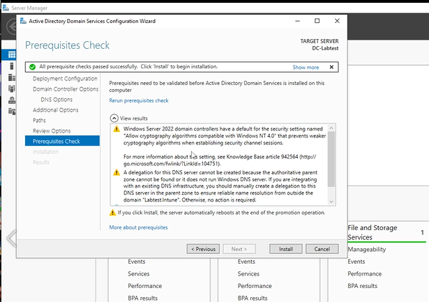 As you can see from the above screenshot, you will see some warnings, but this is perfectly normal. A green check should pop up and press Install. The Domain controller should start installing and can take around 3-4 minutes. Once installed your Virtual Machine will restart.