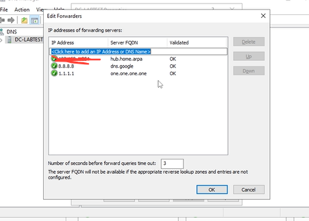 This will open the DNS manager window. Right click your PC name which can be DC-Labtest and press properties. Press the forwarders tab and press edit. After, type in the two IP addresses 8.8.8.8 and 1.1.1.1